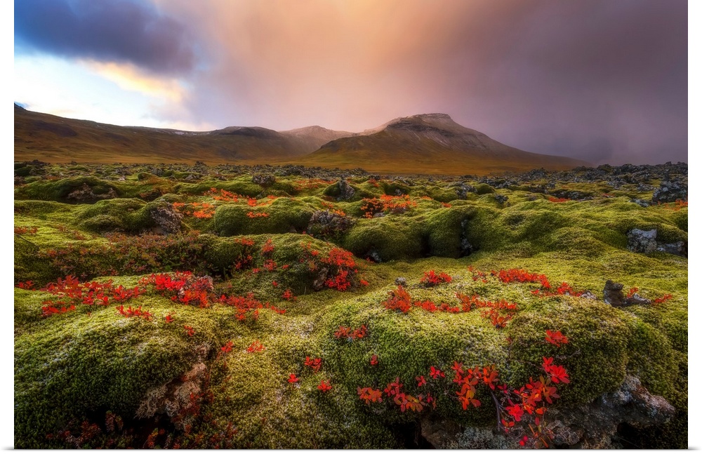 <p>Moss covered lava field at sunrise, Snaefellsness Peninsula; Iceland</p>