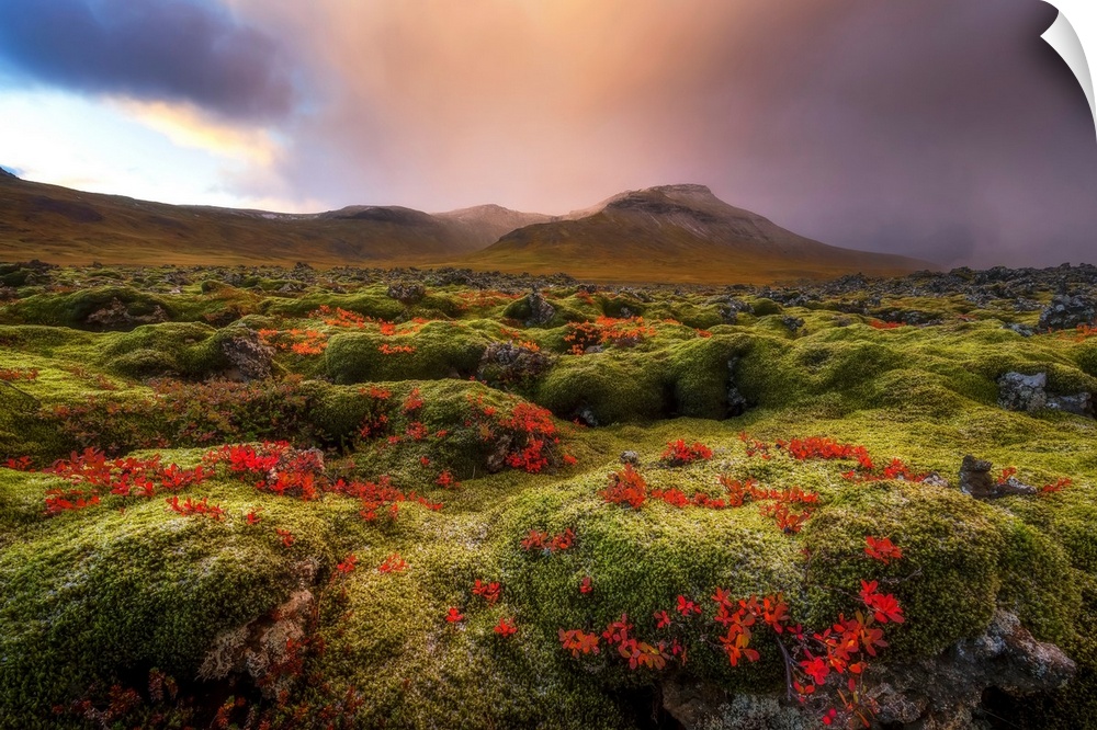 <p>Moss covered lava field at sunrise, Snaefellsness Peninsula; Iceland</p>