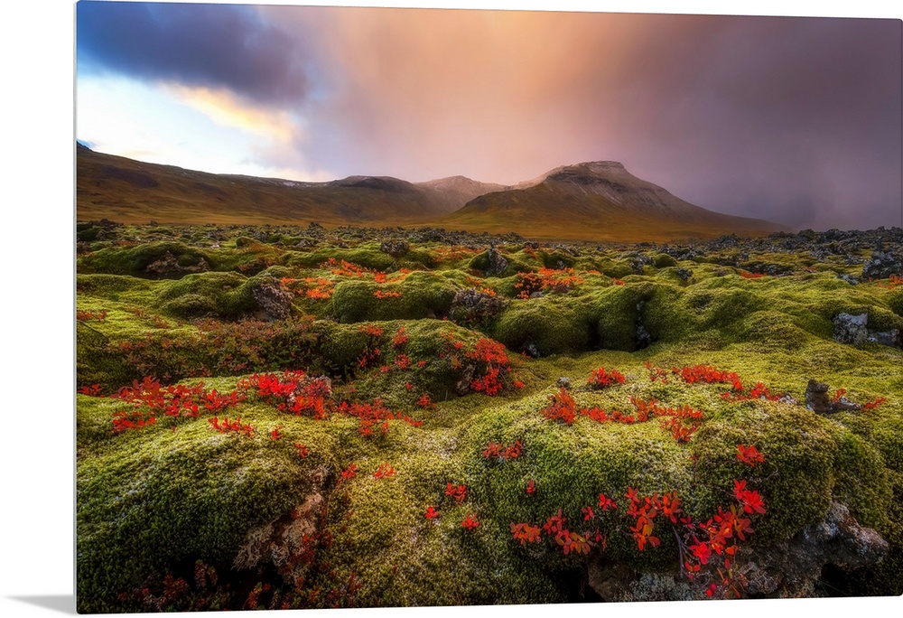 <p>Moss covered lava field at sunrise, Snaefellsness Peninsula; Iceland</p>
