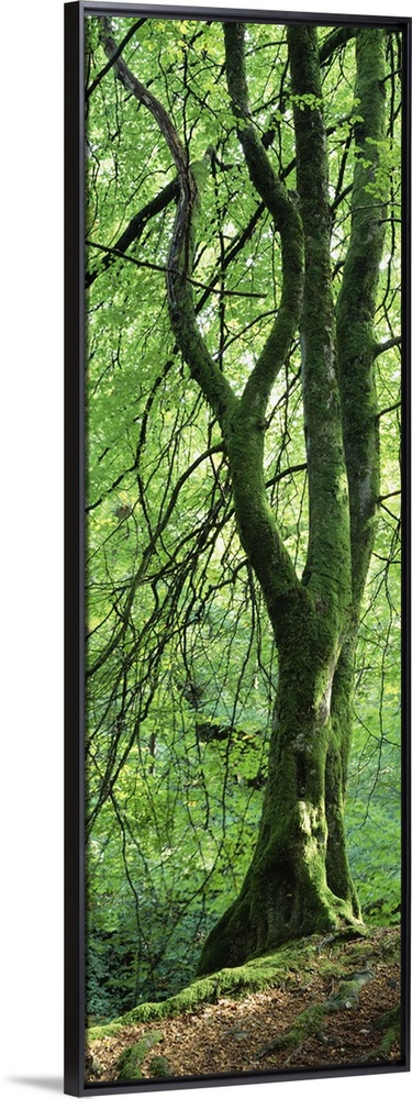<p>Single tree in a forest with trunk covered in moss and lichen, standing the edge of a slope with long spindly branches falling around it.</p>