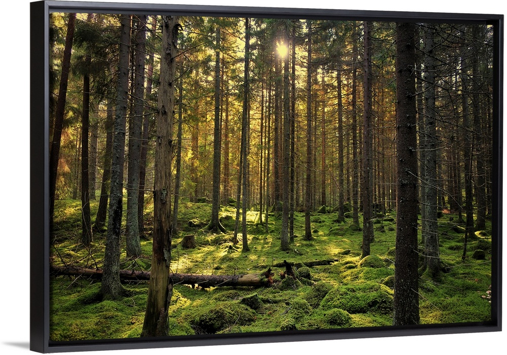 <p>Cozy mossy green forest with warm back-light in the sunset.</p>