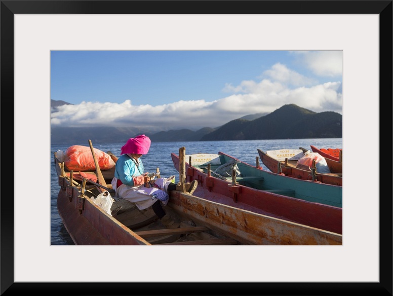 <p>Mosu woman on boat, Luoshui, Lugu Lake, Yunnan, China</p>