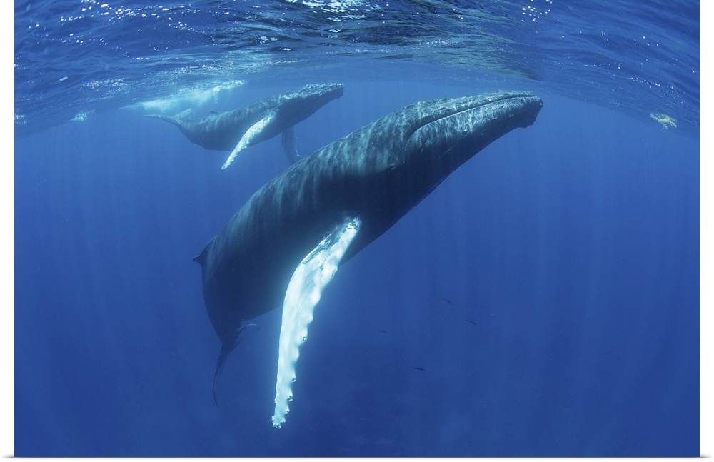 <p>Mother and calf humpback whales swim in the blue waters of the Caribbean Sea.</p>