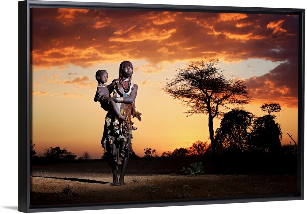 <p>A portrait of a tribes-woman holding her child underneath a sunset sky.</p>