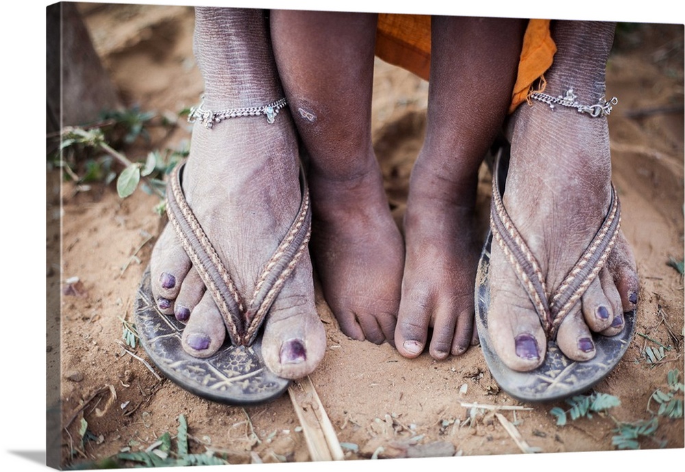 <p>A woman's feet in sandals covered in dust, with her child's small feet between them.</p>