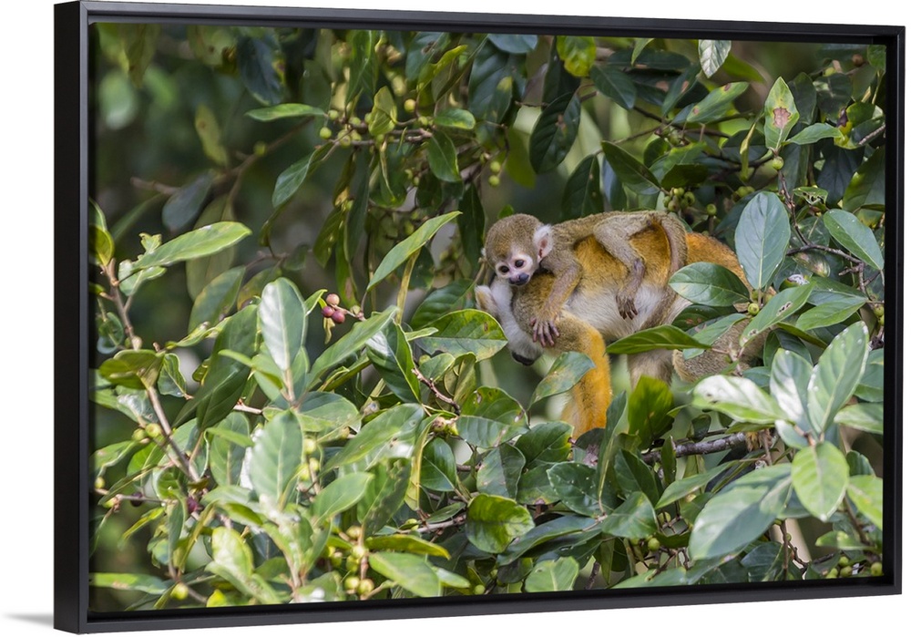 <p>Mother common squirrel monkey (Saimiri sciureus) with infant in the trees on the Nauta Cao, Loreto, Peru, South America</p>
