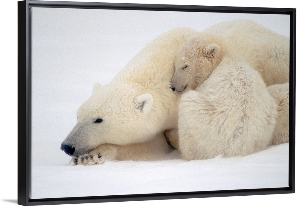 <p>Mother Polar Bear & Cub Huddle in Snow Storm Churchill Canada Winter</p>