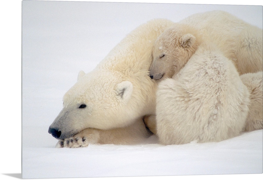<p>Mother Polar Bear & Cub Huddle in Snow Storm Churchill Canada Winter</p>