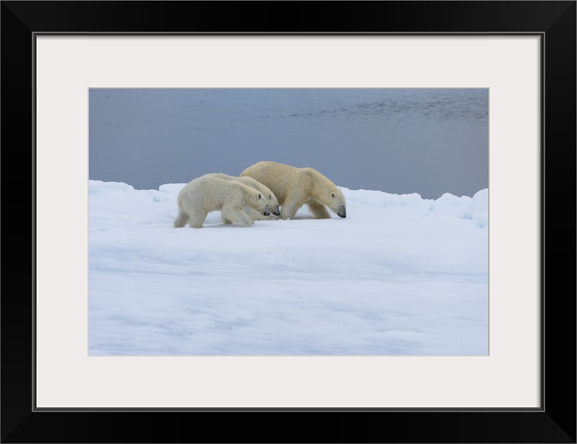 <p>Mother polar bear (Ursus maritimus) walking with two cubs on a melting ice floe, Spitsbergen Island, Svalbard archipelago, Arctic, Norway, Scandinavia, Europe</p>