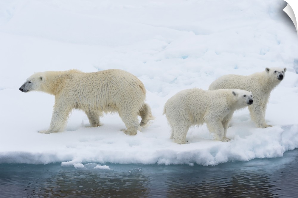 <p>Mother polar bear (Ursus maritimus) with two cubs on the edge of a melting ice floe, Spitsbergen Island, Svalbard archipelago, Arctic, Norway, Scandinavia, Europe</p>