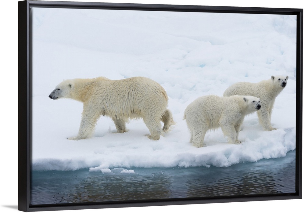 <p>Mother polar bear (Ursus maritimus) with two cubs on the edge of a melting ice floe, Spitsbergen Island, Svalbard archipelago, Arctic, Norway, Scandinavia, Europe</p>