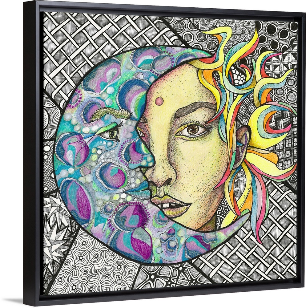 <p>Square illustration of the sun and the moon coming together as one with a black and white background made with different patterns.</p>
