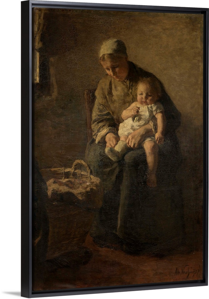 <p>Mother with her Child, by Albert Neuhuys, c. 1880-99. Dutch painting, oil on canvas. A mother sits on a chair with her baby on her lap as she pulls on its stocking. At left is a basket of laundry.</p>