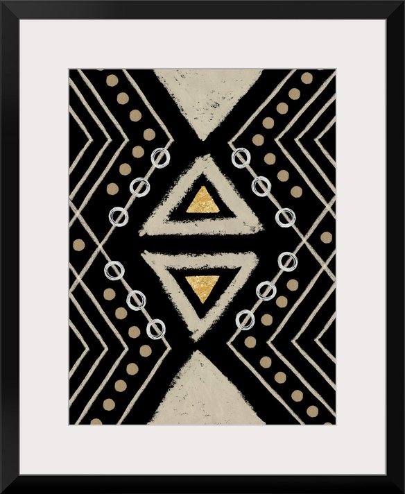 <p>Vertical abstract artwork with tribal-like designs and geometric shapes in brown, black, and gold hues.</p>