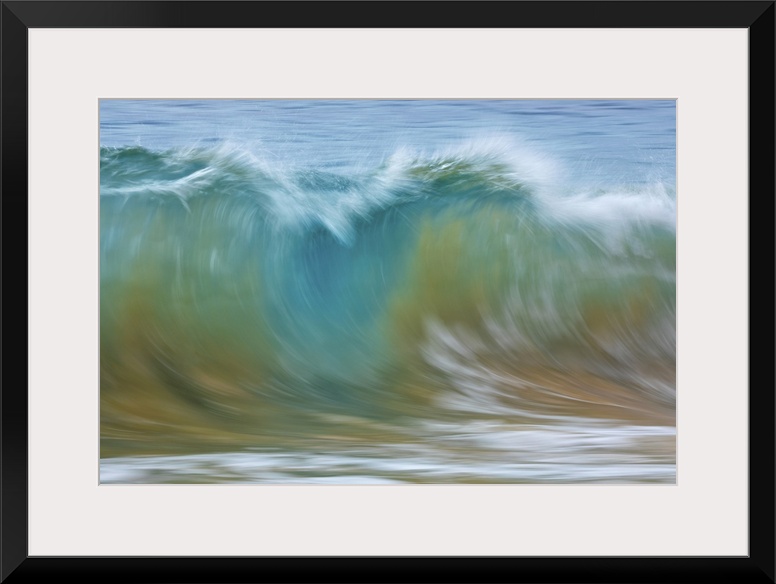 <p>Motion blur of blue rolling waves carrying golden sand at the shore; Kihei, Maui, Hawaii, United States of America.</p>