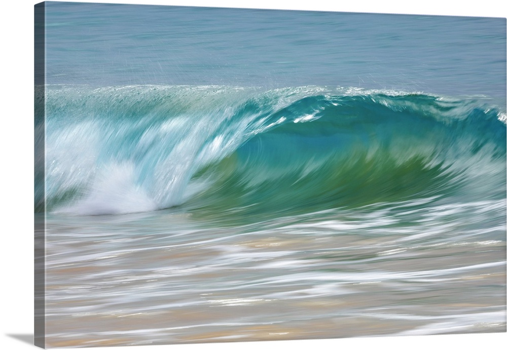 <p>Motion blur of blue rolling waves rolling into the golden sand at the shore; Kihei, Maui, Hawaii, United States of America.</p>