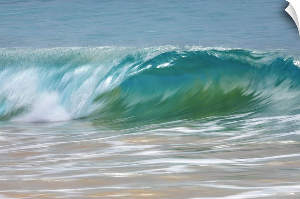 <p>Motion blur of blue rolling waves rolling into the golden sand at the shore; Kihei, Maui, Hawaii, United States of America.</p>