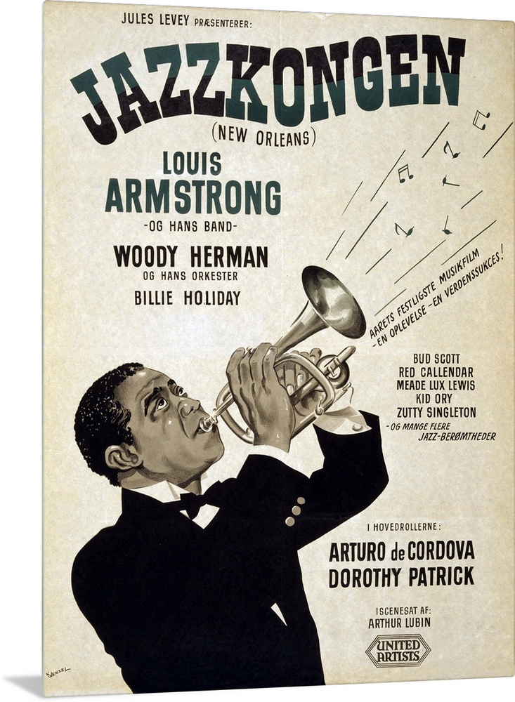 <p>Motion picture poster for Swedish release of NEW ORLEANS (1947), showing star Louis Armstrong playing the trumpet. Bessie Smith and Woody Herman are also listed as cast members.</p>