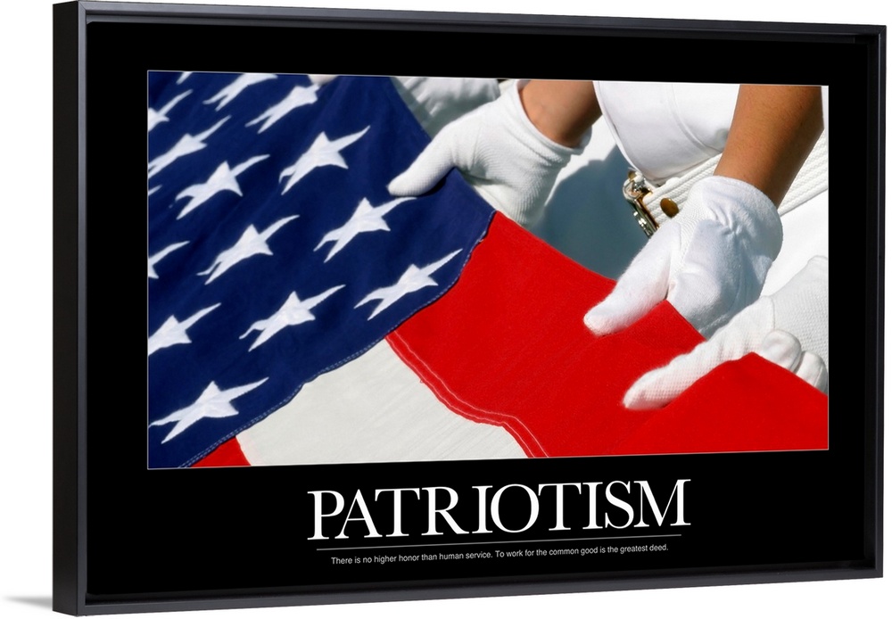 <p>Big, horizontal, motivational wall hanging of gloved hands holding the American Flag, the image is surrounded by a black border, with text at the bottom that reads "Patriotism- There is no higher honor than human service. To work for the common good is the greatest deed".</p>