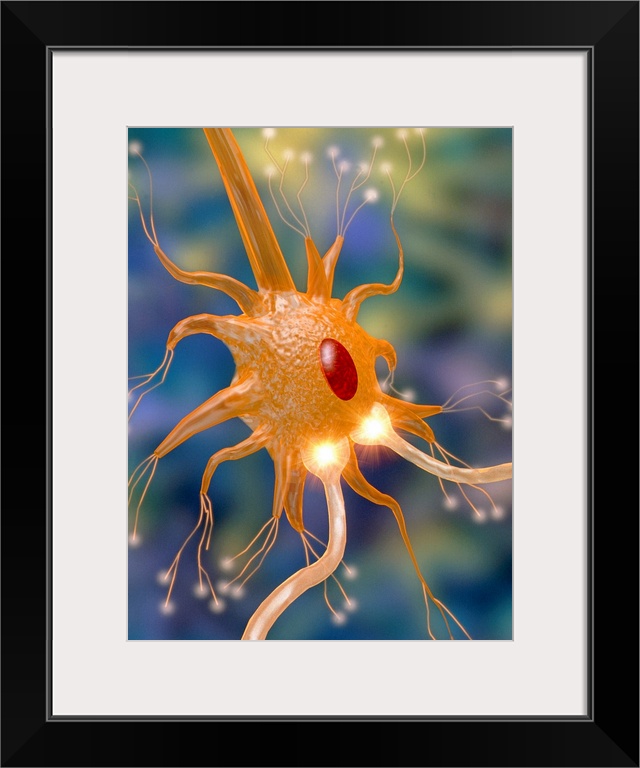 <p>Motor neurone and synapses. Computer graphic of a motor neurone and synapses (glowing yellow bulges, at lower centre). The cell body is at centre. It has a central nucleus (red circle) and axons (upper left, lower centre and lower right) for transmitting information and dendrites (branching processes) for receiving information. The motor neurone cell transmits and receives impulses (messages) to and from other nerve cells at junctions called synapses. The impulses are passed across the synapses by chemicals called neurotransmitters. Motor neurones transmit impulses from the brain to muscles or glands in order to inhibit or excite a response.</p>