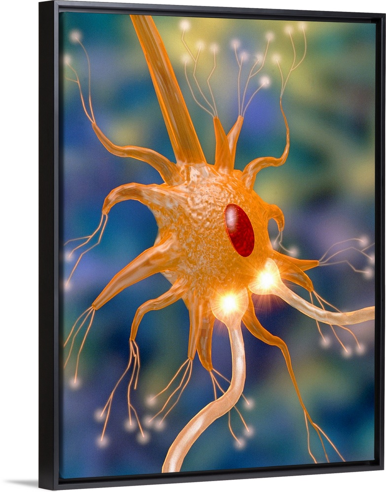 <p>Motor neurone and synapses. Computer graphic of a motor neurone and synapses (glowing yellow bulges, at lower centre). The cell body is at centre. It has a central nucleus (red circle) and axons (upper left, lower centre and lower right) for transmitting information and dendrites (branching processes) for receiving information. The motor neurone cell transmits and receives impulses (messages) to and from other nerve cells at junctions called synapses. The impulses are passed across the synapses by chemicals called neurotransmitters. Motor neurones transmit impulses from the brain to muscles or glands in order to inhibit or excite a response.</p>
