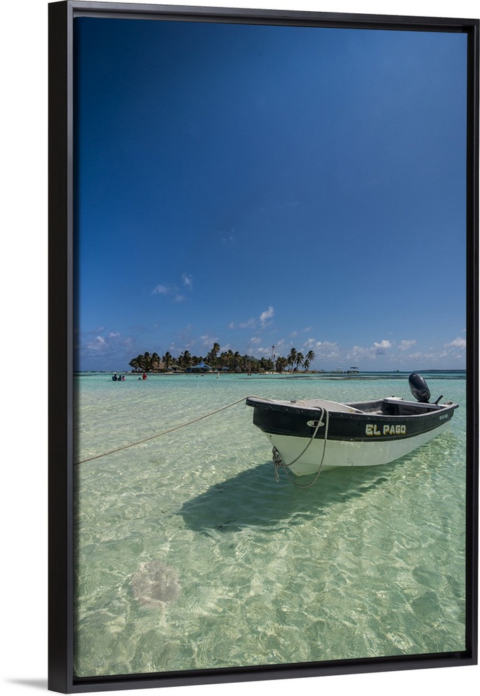 <p>Motorboat anchoring in the turquoise waters of El Acuario, San Andres, Caribbean Sea, Colombia</p>