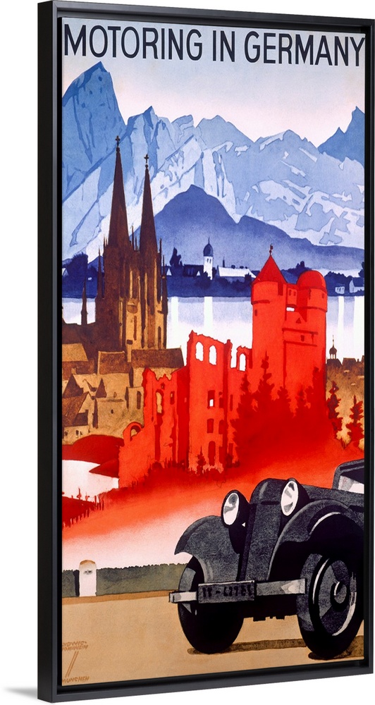 <p>Vintage car advertisement poster for German cars with the front of a car parked on the road and famous German castles, mountains, and lake in the background.</p>