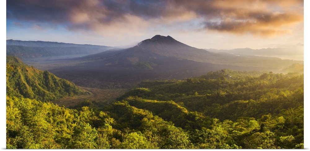 <p>Bali, Indonesia, South East Asia. Panoramic high angle view over the Mount Batur (Gunung Batur) volcano and its caldera's landscape with Lake Batur.</p>