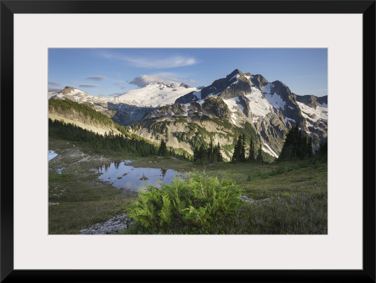 <p>Mount Challenger and Whatcom Peak seen from Tapto Lakes Basin on Red face Peak, North Cascades National Park</p>