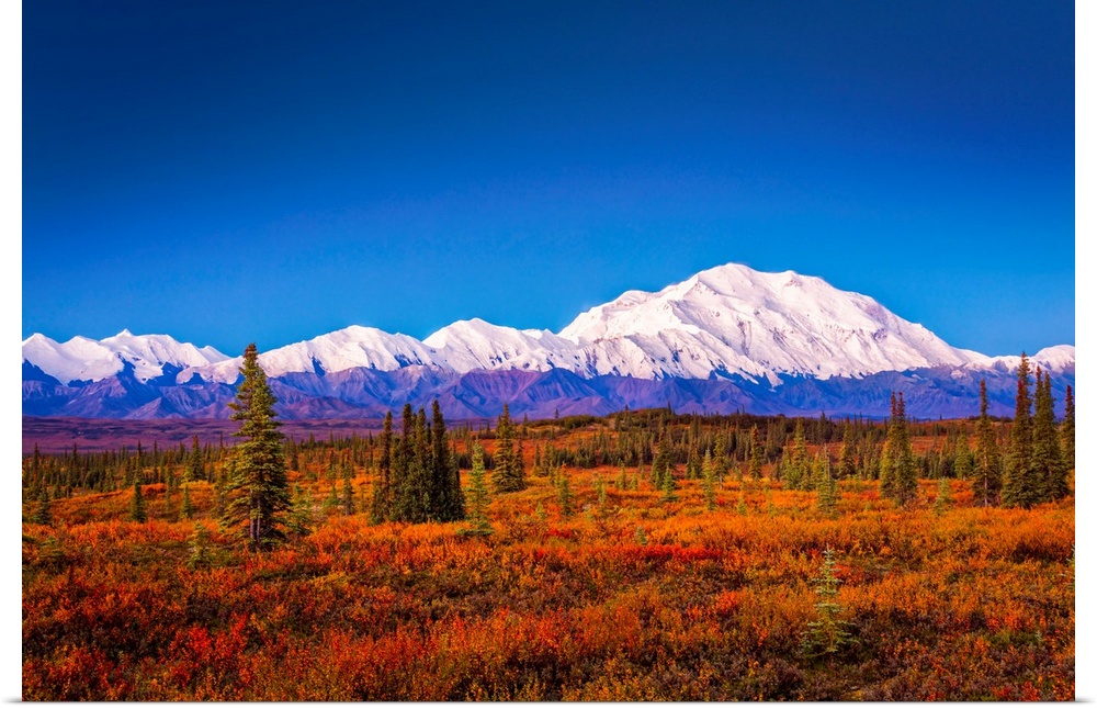 <p>Mount Denali (McKinley) at dawn with fall colors of the tundra in the foreground in autumn, Denali National Park and Preserve, Interior Alaska, Alaska, United States of America</p>