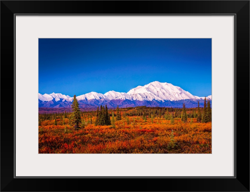 <p>Mount Denali (McKinley) at dawn with fall colors of the tundra in the foreground in autumn, Denali National Park and Preserve, Interior Alaska, Alaska, United States of America</p>