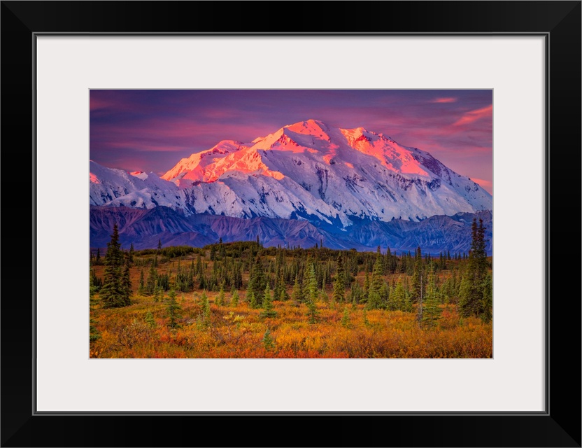 <p>Mount Denali (McKinley) glow at sunrise. Autumn coloured tundra in the foreground in Denali National Park and Preserve, Interior Alaska, Alaska, United States of America</p>