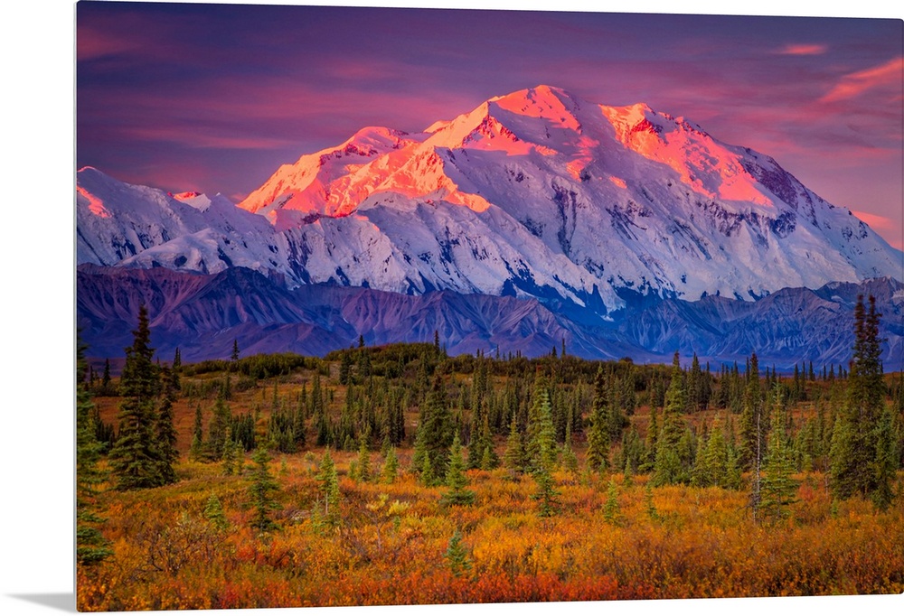 <p>Mount Denali (McKinley) glow at sunrise. Autumn coloured tundra in the foreground in Denali National Park and Preserve, Interior Alaska, Alaska, United States of America</p>
