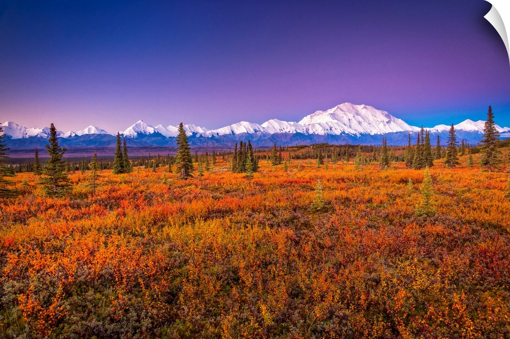 <p>Mount Denali (McKinley) glow at sunrise. Autumn coloured tundra in the foreground in Denali National Park and Preserve, Interior Alaska, Alaska, United States of America</p>