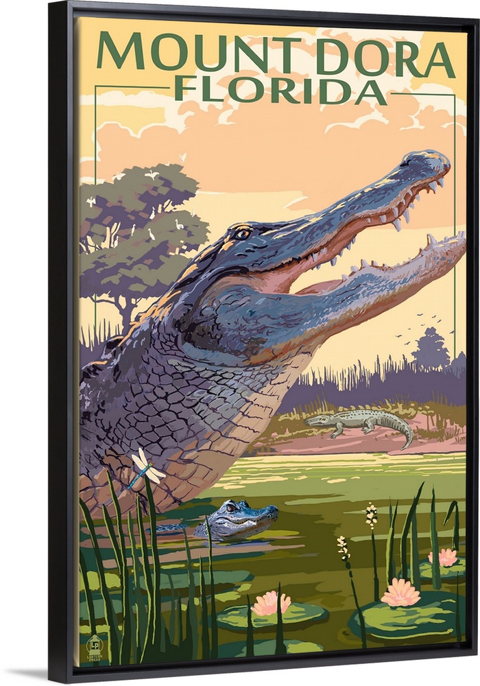 <p>Retro stylized art poster of a mother alligator swimming with her baby in a swamp.</p>