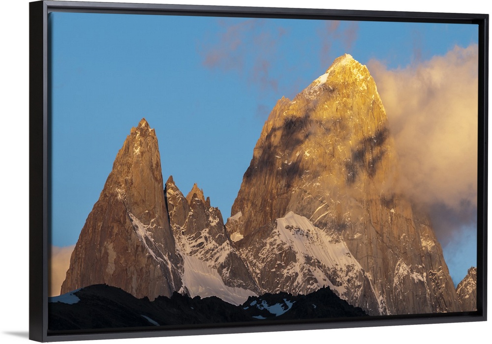 <p>Photograph of mountain spires in South America, with clouds moving in to the frame of the image.</p>