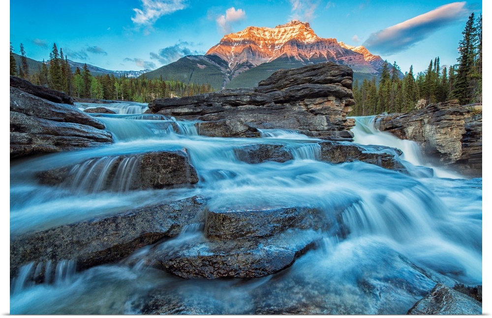 <p>Sunset lights up Mount Fryatt as the Athabasca River flows over Athabasca Falls in Jasper National Park, Alberta, Canada.</p>