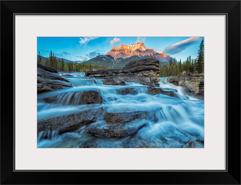 <p>Sunset lights up Mount Fryatt as the Athabasca River flows over Athabasca Falls in Jasper National Park, Alberta, Canada.</p>