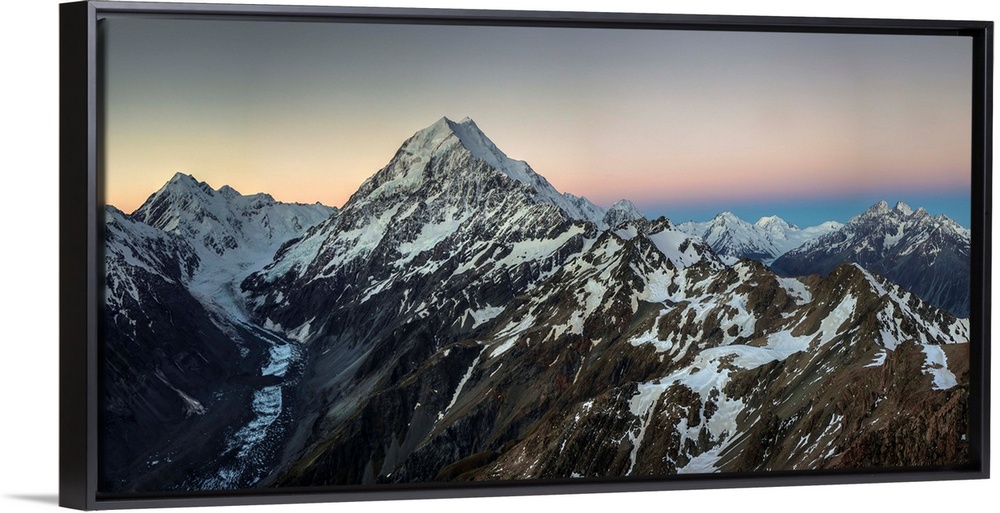 <p>Alpenglow, panorama LtoR: Mounts La Perouse, Aoraki Mount Cook, Tasman glacier, Malte Brun Range, from summit Mt Kinsey, Aoraki Mount Cook National Park, Canterbury</p>