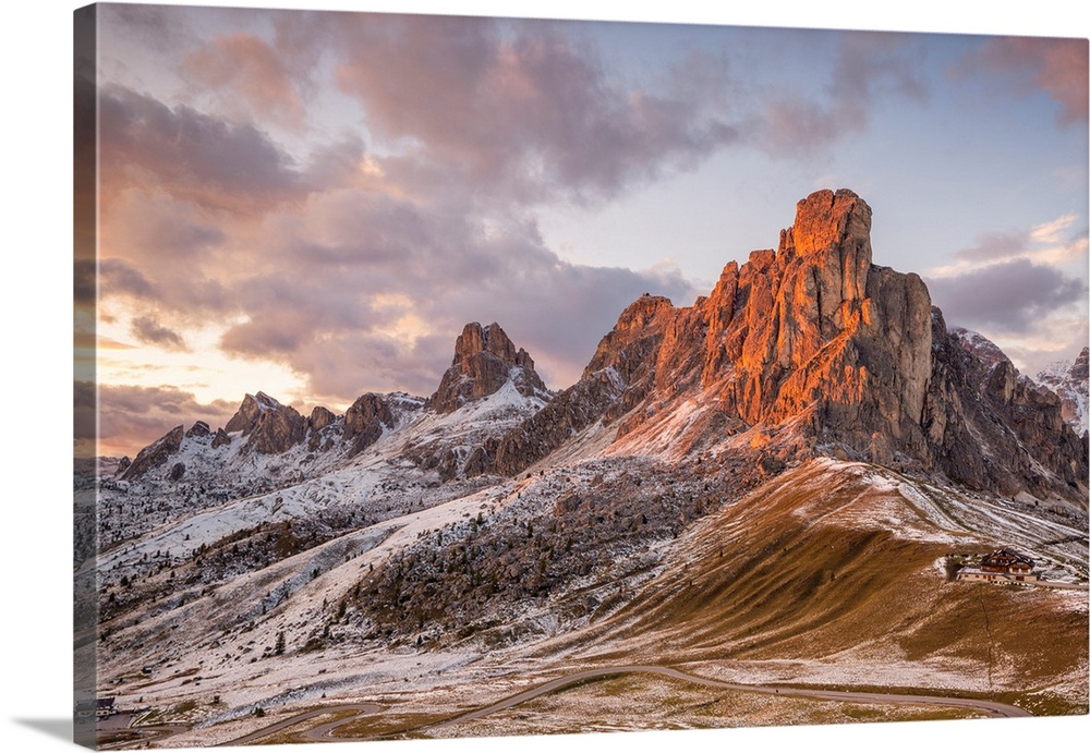 <p>Mount Ra Gusela at sunset, Giau pass, Colle Santa Lucia, Belluno district, Veneto, Italy.</p>