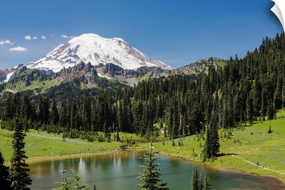 <p>A view of Mount Rainier above Tipsoo Lake, near the top of Chinook Pass on Highway 410 in the Cascade Mountains, Washington, United States of America.</p>