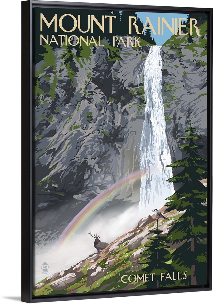 Art Landscapes Rainbows Waterfall Lantern Press Washington Mount Rainier Travel Posters Retro Travel Posters
