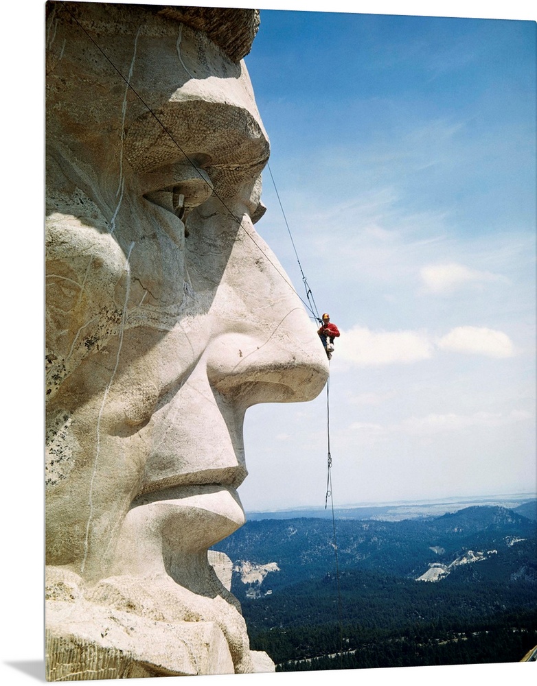 <p>Tourists Never See Mount Rushmore from the Top. Looking more like a pesky fly than a repairman, Mike O'Mera check's Lincoln's nose for cracks in the granite. Even the rugged images of Mount Rushmore require their regular facials.</p>