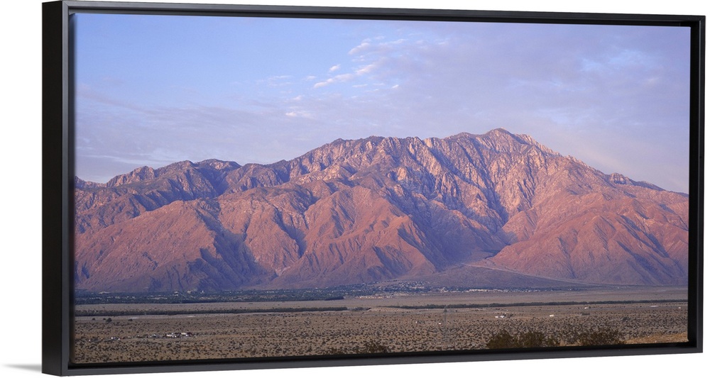<p>Wide angle picture of San Jacinto Peak in California. The sun is setting out of view and shining onto the mountain range.</p>