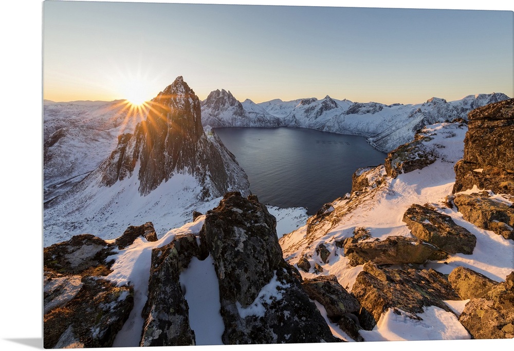 <p>First light of sunrise on Mount Segla and Mefjorden framed by the frozen sea seen from peak Hesten, Senja, Troms, Norway, Scandinavia, Europe</p>
