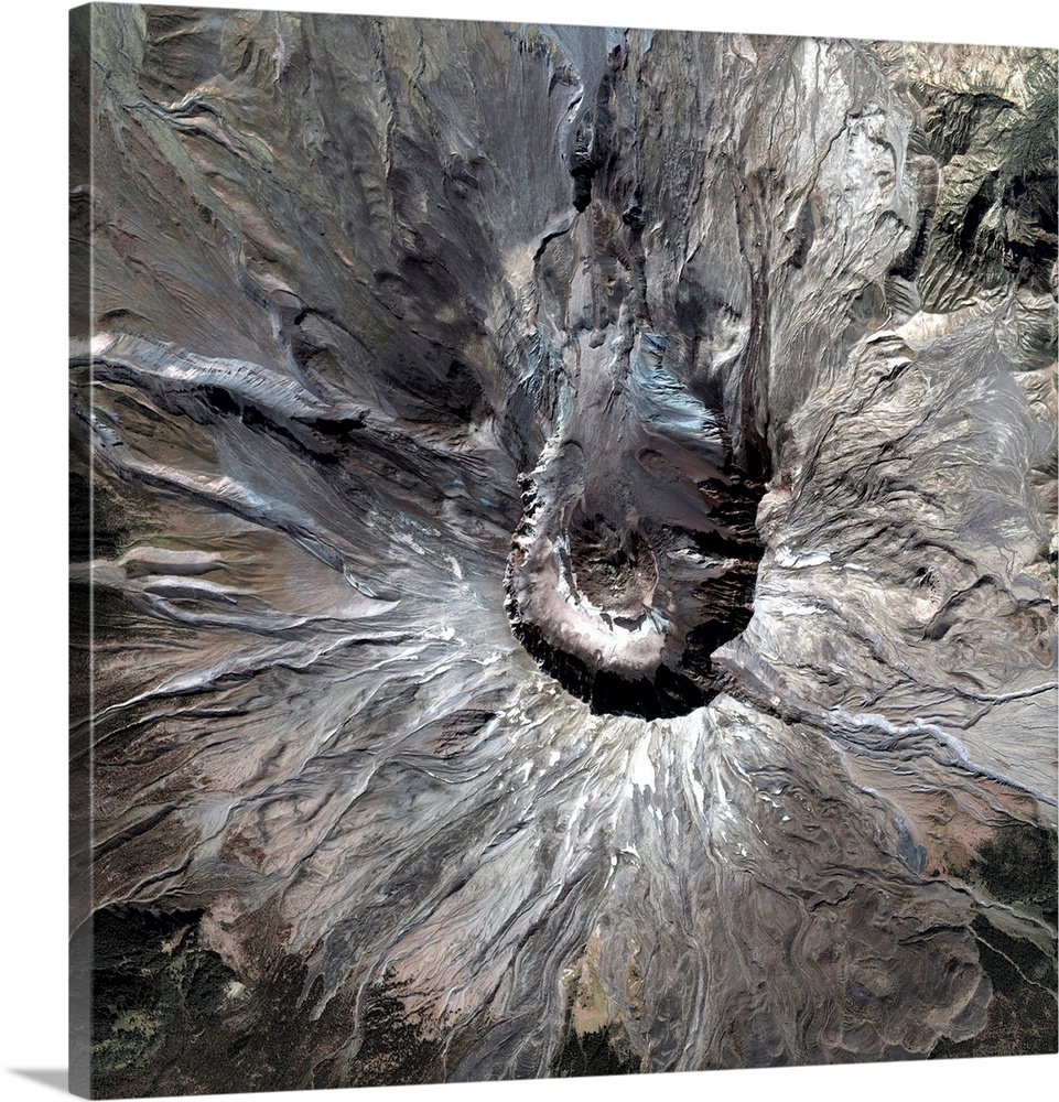 <p>Mount St Helens. Satellite image of the summit of the Mount St Helens volcano, in Washington State, USA. The summit crater (centre, 2 kilometres wide and 640 metres deep) was formed during a massive volcanic eruption on 18 May 1980, following months of volcanic activity. The bulging northern face of the volcano collapsed and a massive pyroclastic flow erupted northwards (towards top), leaving a massive gap in the crater that formed. The volcano was reduced in height by 400 metres, hundreds of square kilometres of forest were destroyed and 57 people died. A post-eruption lava dome (centre) formed in the crater. Image taken by the Ikonos satellite on 13 September 2003.</p>