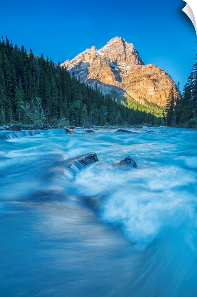 <p>Mount Stephen lights up as the sun rises while the Yoho river flows by, Yoho National Park, Canada.</p>