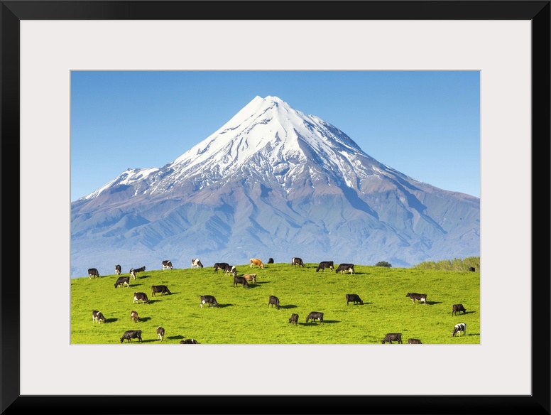 <p>Mount Taranaki (Egmont) and grazing dairy cows, Taranaki, North Island, New Zealand</p>