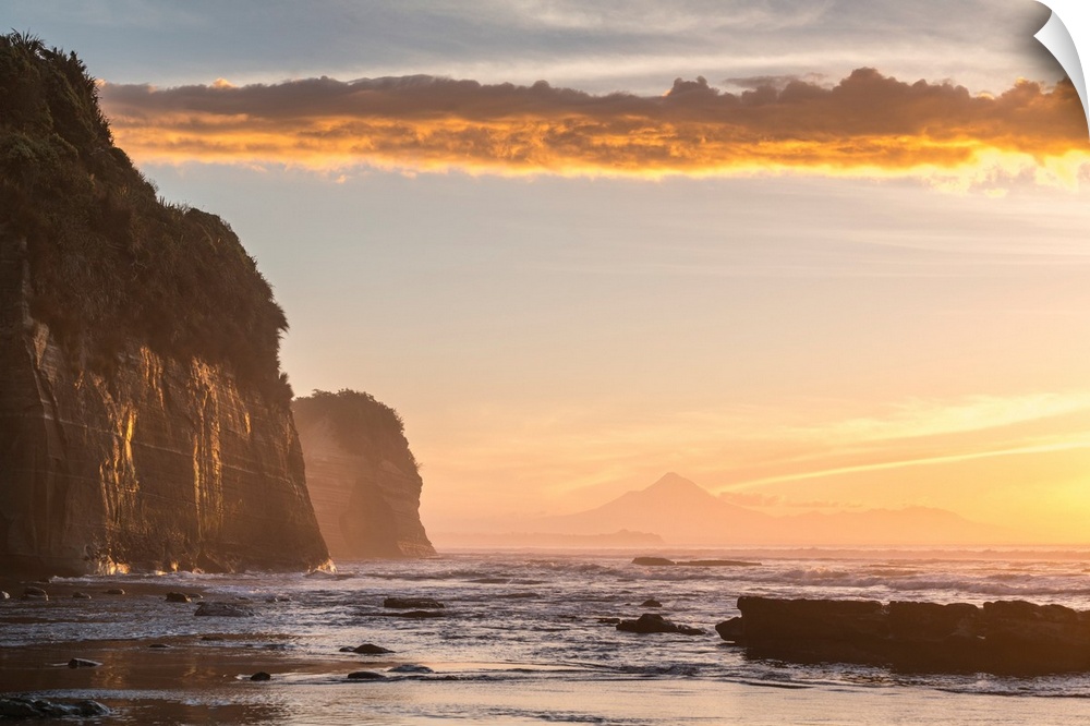 <p>Elephant rock and Mount Taranaki silhouette in the background, at sunset. Tongaporutu, New Plymouth district. Taranaki region, North Island, New Zealand.</p>