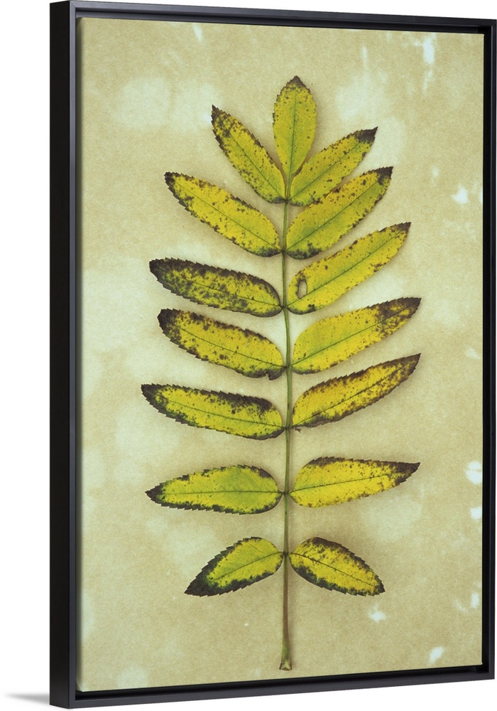 <p>Single sprig of yellow autumn leaves of Rowan or Mountain ash or Sorbus aucuparia lying on antique paper</p>